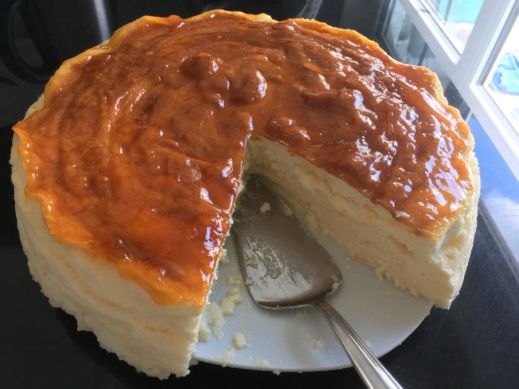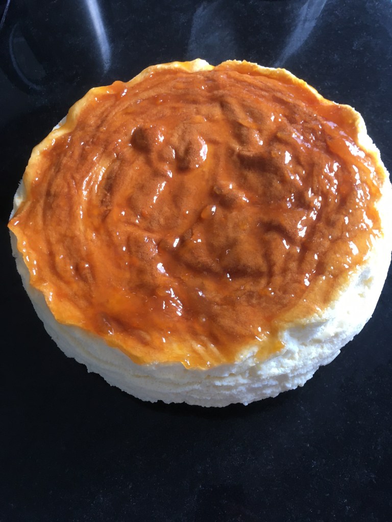 Amestecăm cele 2 linguri de gem de caise cu două linguriţe de apă (eventual dacă gemul e neuniform, îl trecem printr-o sită întâi) şi apoi pensulăm glazura astfel obţinută pe suprafaţa prăjiturii, direct în cuptor. Bagăm la loc prajitra în cuptor, dar lăsăm uşa întredeschisa, eventual poziţionând coada unei linguri de lemn şi lăsăm prăjitura să se răcească până la temperatura camerei. Apoi tragem o folie de plastic peste gulerul înlat de hârtie de copt încercând să nu atingem şi glazura şi bagăm doar forma de copt cu prăjitura (fără folia de aluminiu sau tava cu apă) la frigider peste noapte.