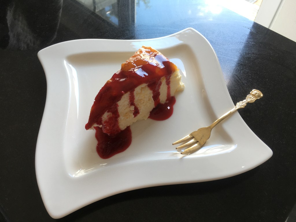 După o noapte la frigider scoatem peretele detaşabil al formei şi îndepărtăm guleraşul de hârtie de copt. Eventual trecem o spatula de cofetărie sau cuţit între discul de hârtie de pe partea inferioară a prăjiturii şi fundul formei pentru a desface orice aderenţă. Prăjitura se taie în felii frumoase peste care se pune o linguriţă de sos de tayberry. Textura uşoară, extrem de aerată a prăjiturii e echilibrată de minune de aroma şi de ideea de aciditate a sosului de tayberry. Iar de culoarea lui nemaipomenită rubinie pe fundalul unei prajituri deschise ce as mai putea spune? Un adevarat deliciu, dar fără foarte multe calorii, fără unt ori ulei si doar cu foarte puţină făină. Aceasta este una dintre prăjiturile mele preferate!