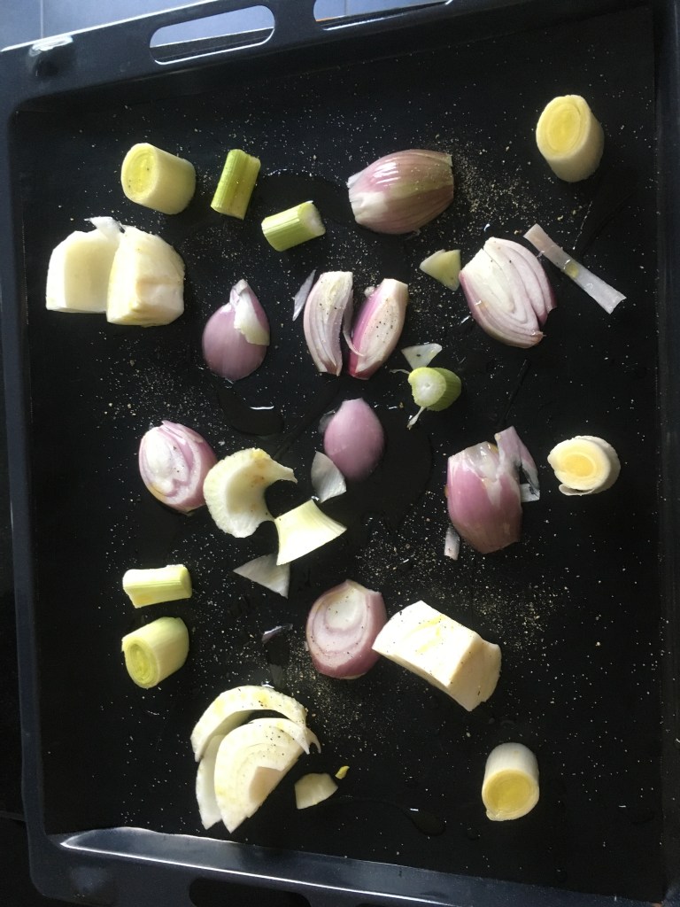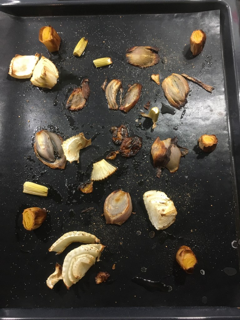 Prazul şi feniculul se curăţă şi se taie în bucăţi mari. Cepele curăţate se taie în sferturi sau dacă sunt foarte mari în 3-4 inele groase. Legumele se stropesc cu două linguri de ulei (de măsline am folosit eu), se sărează şi se presară cu piper proaspăt măcinat şi se dau la cuptorul preîncălzit la 180C cu ventilaţie (200C fără ventilaţie) timp de 20-25 de minute. Miroase nemaipomenit feniculul copt!