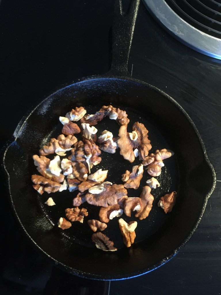 În acest timp se prăjesc nucile fără ulei într-o tigaie de fontă sau de inox. Tigăile de teflon sau cu un strat antiaderent de marmură sunt de evitat aici căci la temperaturi înalte şi pe uscat acestea pot elibera compuşi toxici.