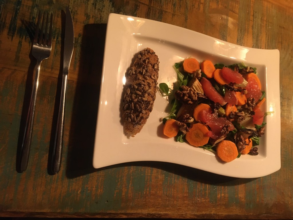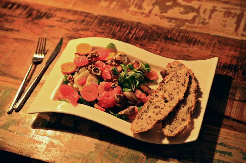 O salată de zile mari, de sărbătoare sau de impresionat invitaţii cu o combinaţie rafinată de arome şi o explozie de gusturi şi de prospeţime în miez de iarnă. O salată care îi va încânta şi pe cei mai înrăiţi carnivori – pe încercatelea! Combinaţia de gusturi şi de texturi este foarte echilibrată şi poate fi oferită atât pe post de garnitură (şi atunci ingredientele de mai jos ajung pentru 4 porţii), cât şi pe post de fel principal vegan, dar gourmet, mai ales lângă 1-2 felii de pâine proaspătă cu maia. Să mai zic şi că e uşor de pregătit şi că este şi un fel de mâncare sănătos, plin de vitamine, atât de importante pentru a traversa cu bine perioada rece şi întunecată a anului?