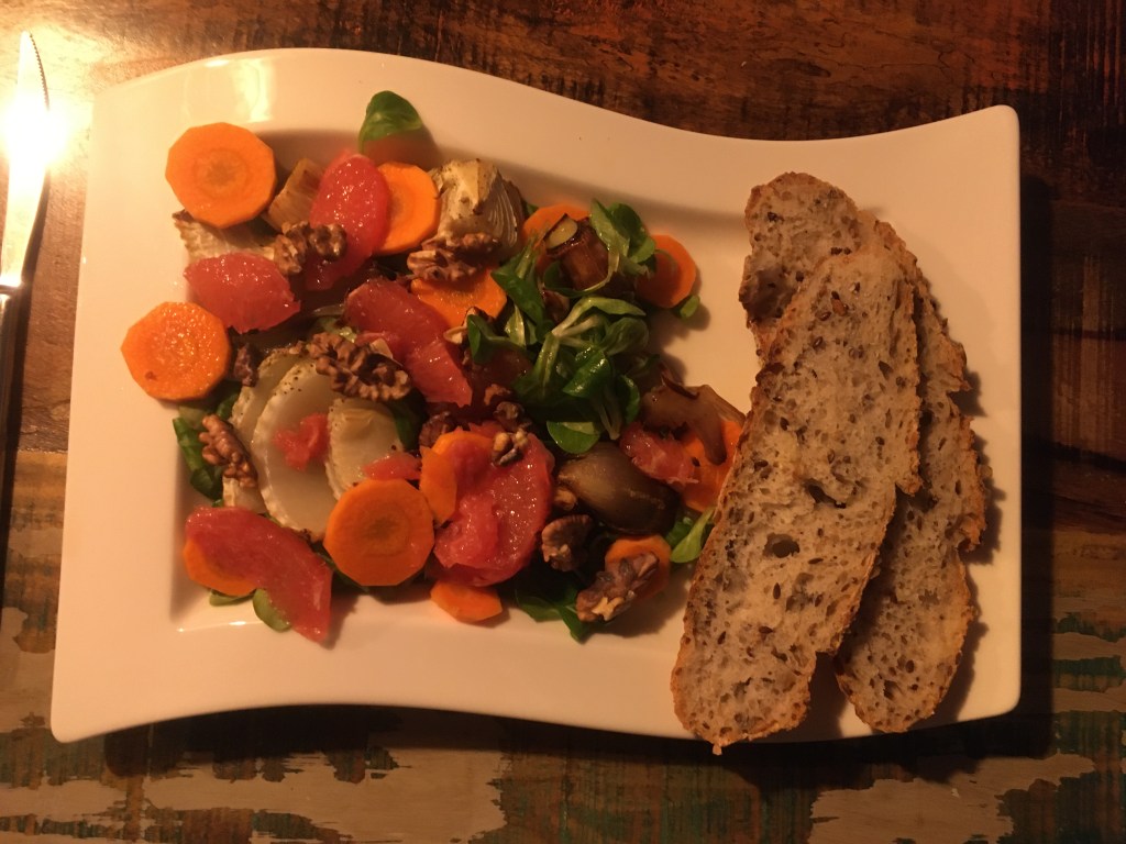 Mai rămâne doar să spălam şi curăţăm valerianella şi să curăţăm şi taiem morcovul rondele. În fine, se aşează toate componentele pe farfurie, se admiră frumuseţea de salată ce a rezultat şi se savurează până la ultima frunzuliţă. Noi am mâncat-o alături de o felie de pâine călduţă de casă cu maia naturală şi cu seminţe. O desfătare pur şi simplu! Nici nu vă imaginaţi ce pierdeţi dacă nu o încercaţi! Legumele coapte caramelizate, prospeţimea salatei, morcovul crocant, dulceaţa decentă a grepfrutului şi nucile prăjite… o nebunie!