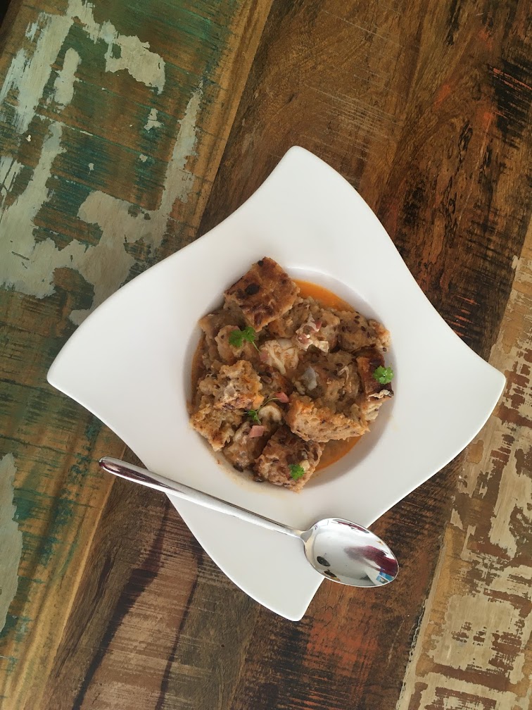 Prepar adesea această supă pentru un prânz rapid, ba am folosit reţeta şi în bucătăria miniaturală a rulotei tocmai pentru că e un preparat nepretenţios, dar foarte savuros. Începem prin tăierea pâinii în cubuleţe mărişoare cu latura cam de 1,5 cm. Vorbim de un preparat rustic, deci nu ne cramponăm de imperative geometrice, ci lucrăm relaxat cu aproximaţie. Încingem 1-2 linguri de ulei de măsline într-o tigaie încăpătoare (eu prefer un wok) şi adăugăm pâine tăiată amestecând continuu preţ de câteva minute până se rumenesc crutoanele. Obiectivul acestei etape este să impregnăm uniform crutoanele în uleiul de măsline şi să le lăsăm să dezvolte acele minunate arome de prăjit (reacţia Maillard), evident fără a le arde. Scoatem si dăm deoparte crutoanele cănd sunt gata.