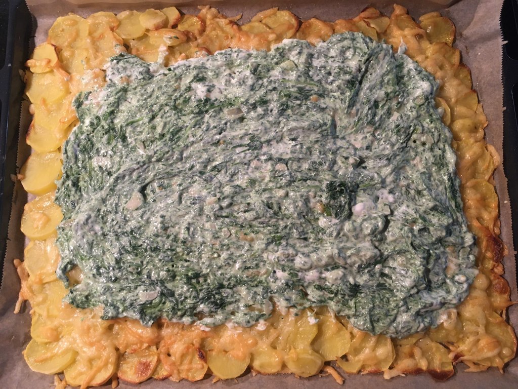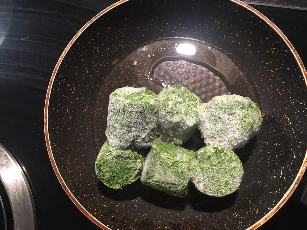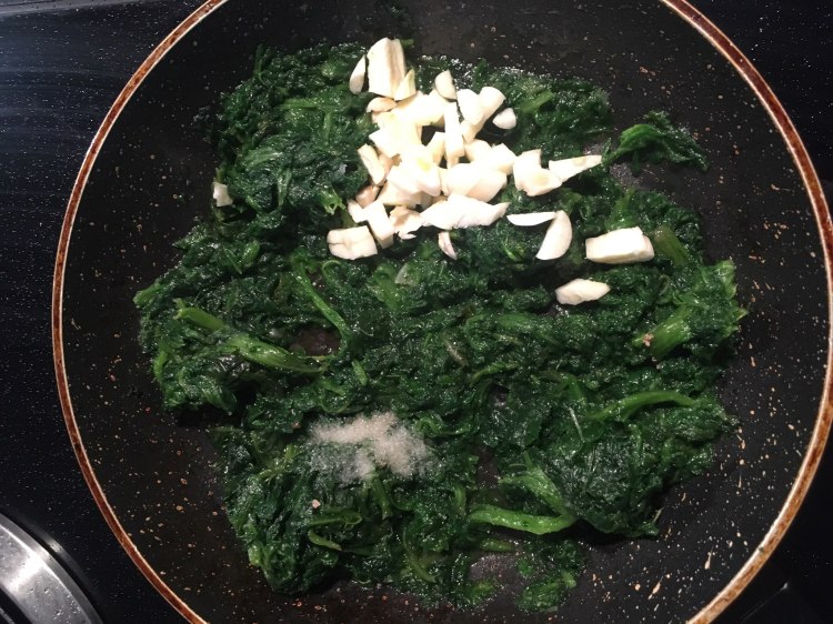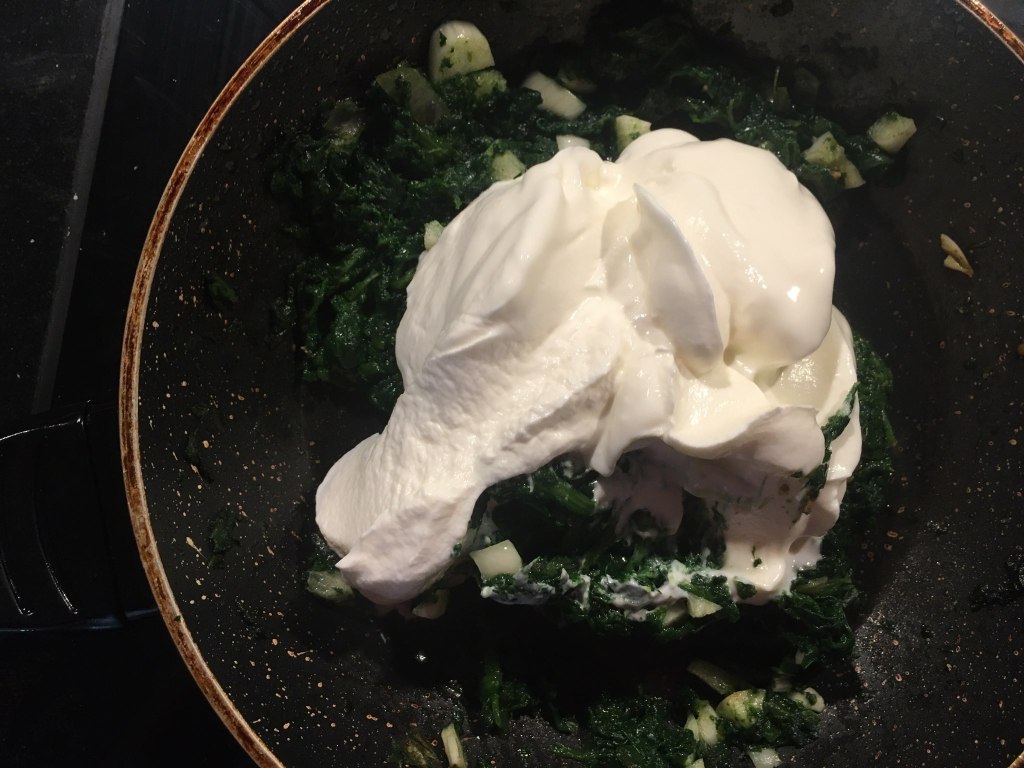 În paralel într-o alta tigaie se pun două linguriţe de ulei în care se căleşte spanacul şi când acesta începe să se înmoaie se adaugă usturoiul şi o jumătate de linguriţă de sare. Când şi usturoiul e călit se ia de pe foc şi se amestecă cu iaurtul grecesc. Din nou, eu folosesc această opţiune pentru că are mai puţine calorii decât smantâna sau ricotta, dar cu siguranţă că şi acestea ar fi alegeri foarte gustoase.