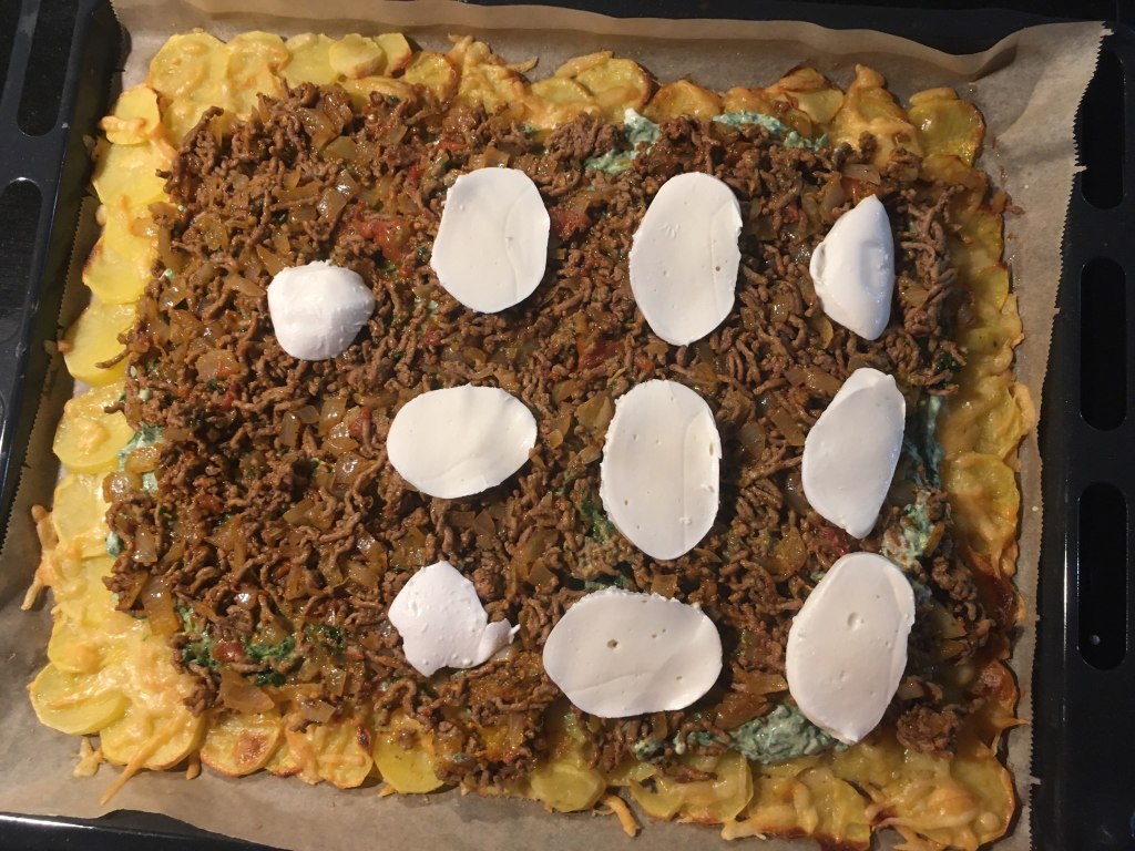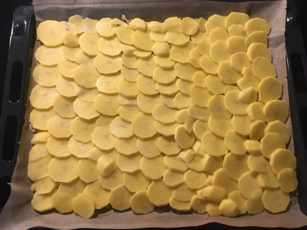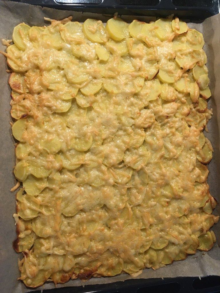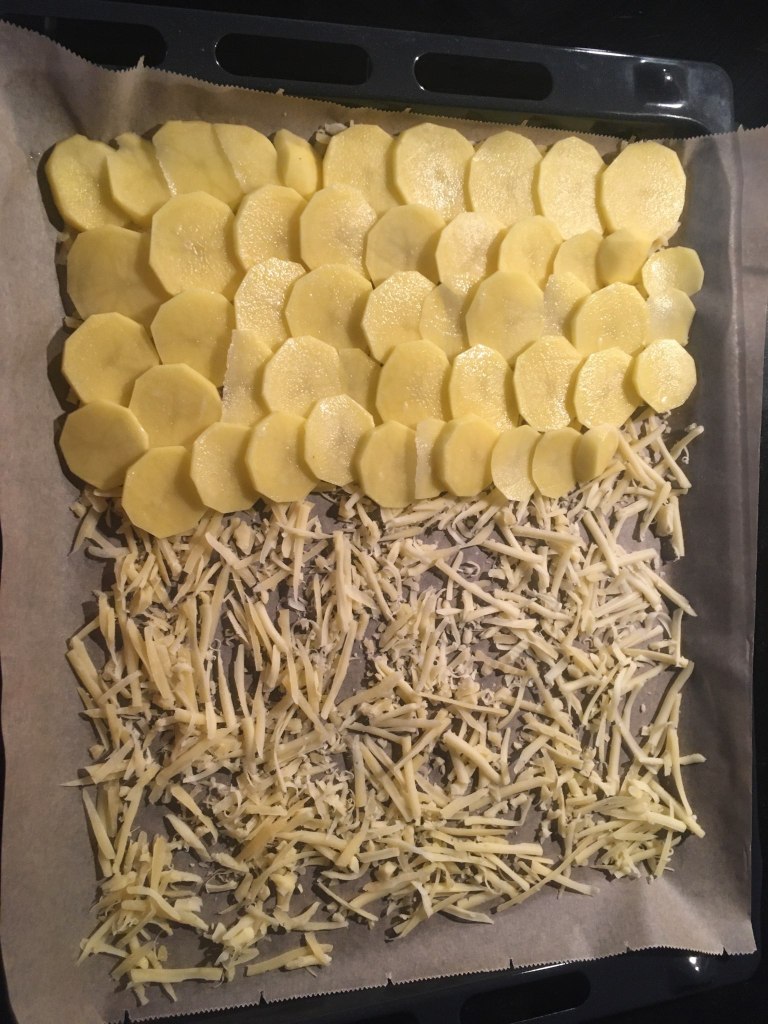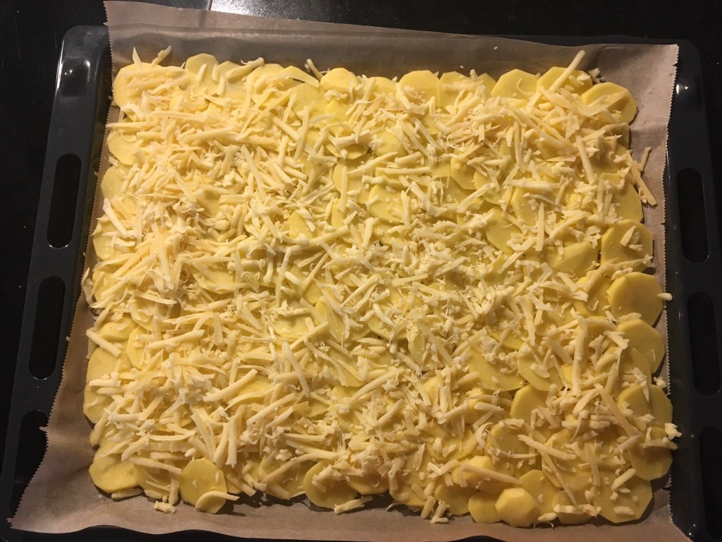 Mie îmi place să încep prin a rade Gouda, dar la fel de bine s-ar putea folosi şi caşcaval sau un alt tip de brânză fondantă (care să se topească frumos la cuptor, nu să se usuce precum telemeaua!). Presar un pic mai bine de jumătate din brânza rasă în strat uniform pe o tavă mare aşternută cu hârtie de copt şi încep să curăţ cartofii pe care apoi îi tai din cuţit felii cât mai subţiri şi mai egale. Distribui feliile de cartof pe toată suprafaţa tăvii suprapunându-le uşor la margini pentru a forma o foaie şi apoi presar şi restul de brânză rasă desupra. Sărez cu o linguriţă de sare fină şi dau tava preţ de 30 de minute în cuptorul preîncălzit la 180C. Brânza se va topi şi va lipi feliile de cartof rumenite într-o foaie. Notă: cu cât se foloseşte mai multă brânză cu atât foaia va fi mai rezistentă, dar în încercarea de a limita numărul de calorii eu folosesc doar cât să se lipească cât de cât feliile de cartof.