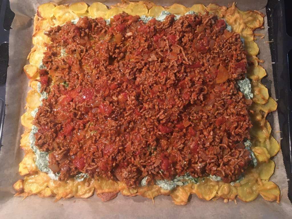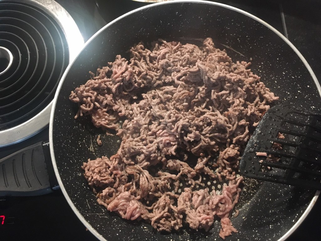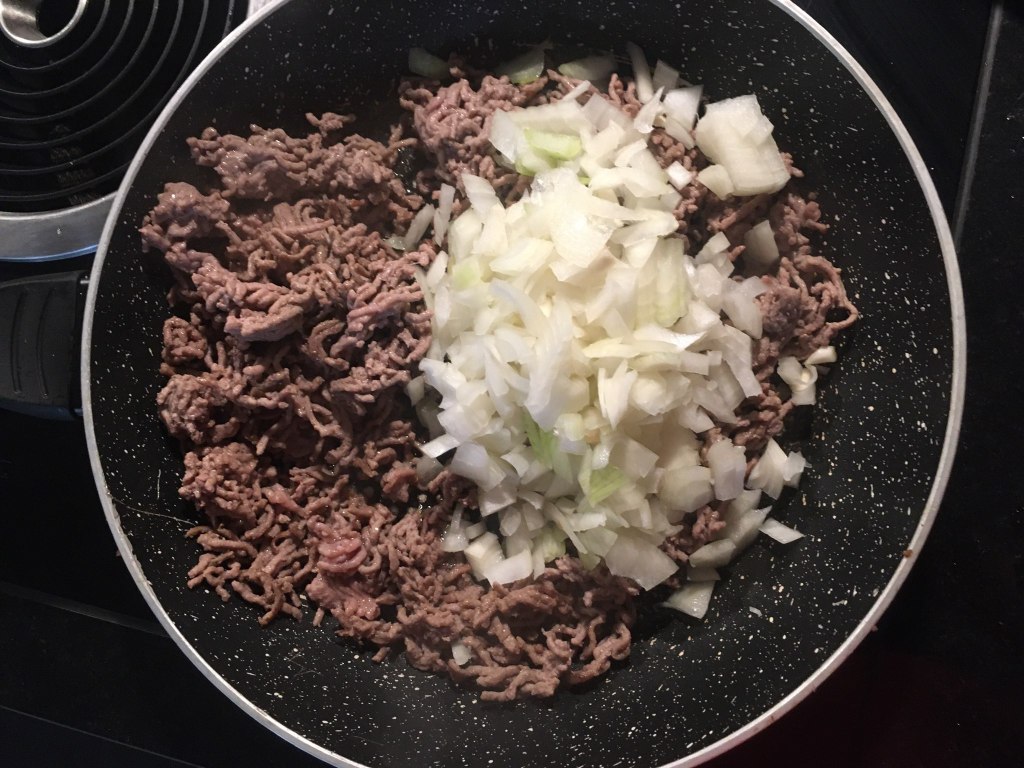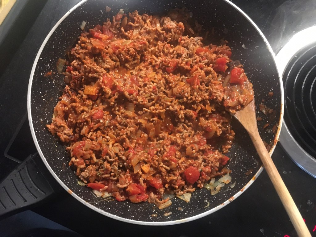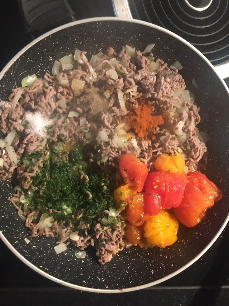 Cât foaia e la cuptor lucrez la două tigăi pe aragaz. Într-o tigaie antiaderentă pun carnea tocată şi o las până e bine rumenită, amestecând frecvent pentru a preveni arderea ei. În acest timp, curăţ o ceapă şi doi căţei de usturoi pe care îi toc fără să îi amestec. Când e bine rumenită carnea (ştim că reacţia Maillard de caramelizare e cea care dă savoare cărnii) adaug ceapa şi o las până devine aurie. Notă: se poate proceda şi invers, clasic adică se căleşte ceapa tocată în ulei şi apoi se adaugă carnea tocată, dar eu prefer să evit folosirea suplimentară a uleiului, mai ales că mi se pare că lasă suficientă grăsime carnea tocată la prăjit. E momentul pentru condimente: o linguriţă de boia dulce, câte o jumătate de linguriţă de sare şi de piper şi o mână bună de pătrunjel tocat. După încă un minut e rândul roşiilor tăiate cubuleţe, iar tigaia se lasă pe foc până când compoziţia scade bine, amestecând de câte ori e nevoie pentru a nu se prinde.