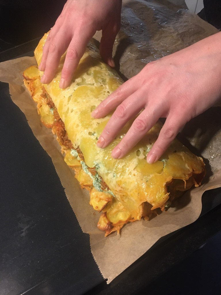 În general, până termin cele două compoziţii se scurg cele 30 de minute pe care foaia de cartofi cu brânza le petrece în cuptor. O scot şi întâi distribui compoziţia de spanac în strat cât mai uniform, încercând să las marginile libere. Deasupra împart în strat omogen compoziţia de carne tocată şi în final împrăştii şi felii de mozzarella. E timpul să rulăm totul pe lat începând dintr-un capăt, ajutându-ne de hârtia de copt şi având grijă evident la fiecare pas să scoatem hârtia de copt pentru a nu sfârşi în interiorul ruladei. Rulada, repoziţionată în centrul tăvii, poate merge la cuptor pe aceeaşi hârtie de copt, preţ de încă 15 minute în cuptorul preîncălzit la 180C. Se garniseşte cu pătrunjel proaspăt şi se taie felii care îi vor încânta cu siguranţă pe toţi mesenii peste măsură. Credeţi-mă că nici nu ştiţi ce pierdeţi dacă nu încercaţi măcar o dată această reţetă simplă!