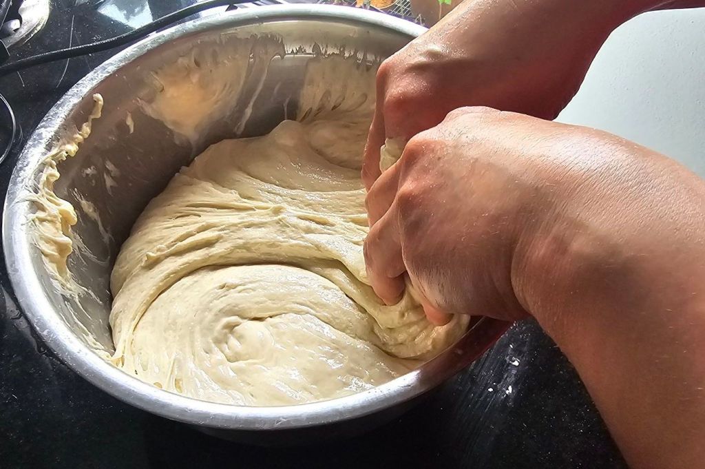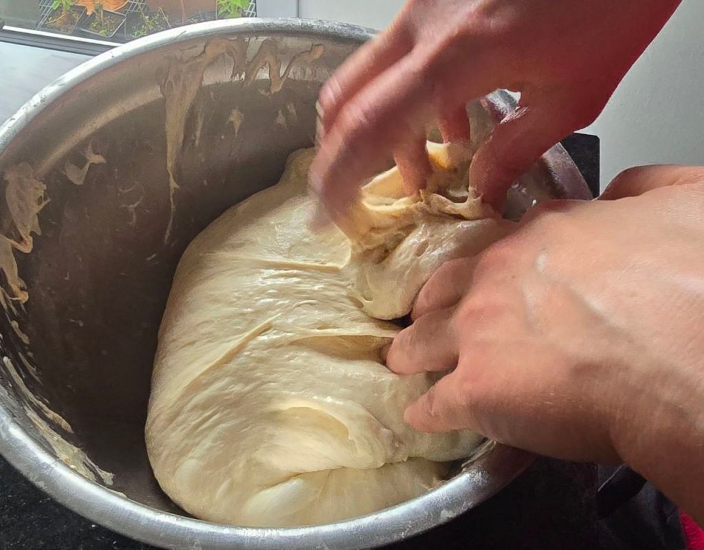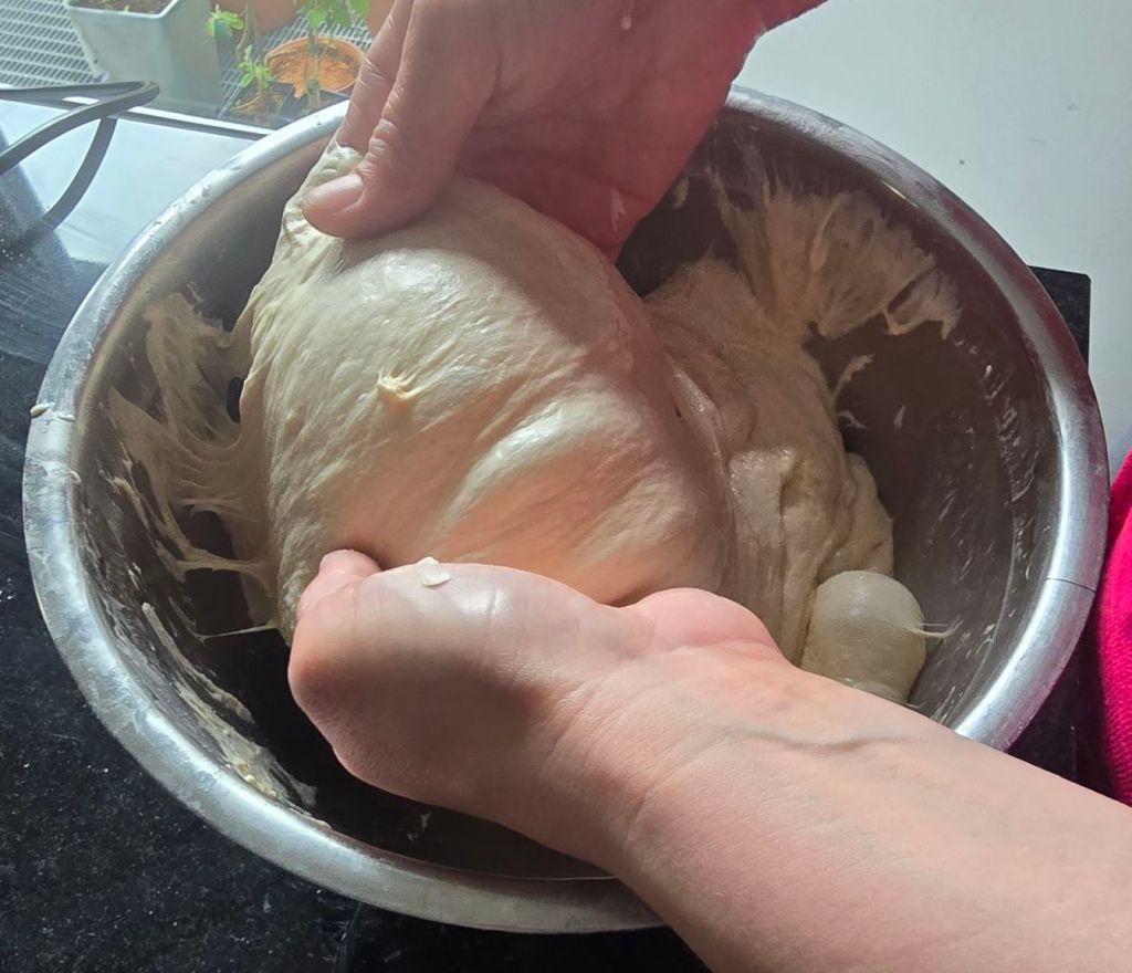 Pentru a ne bucura la final de un produs crescut frumos e neapărat necesar să facem o serie de minim patru întinderi și plieri la intervale de 30 de minute. Acestea vor dezvolta rețeaua de gluten și vor schimba radical consistenta aluatului. Din fericire, fiecare astfel de întindere – pliere (în engleză stretch and fold, S-F) ne va solicita mai puțin de un minut, restul fiind doar timpi de așteptare.