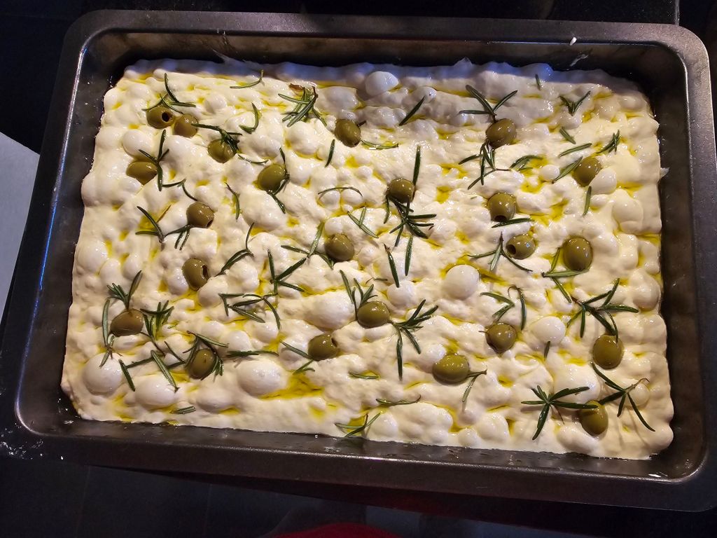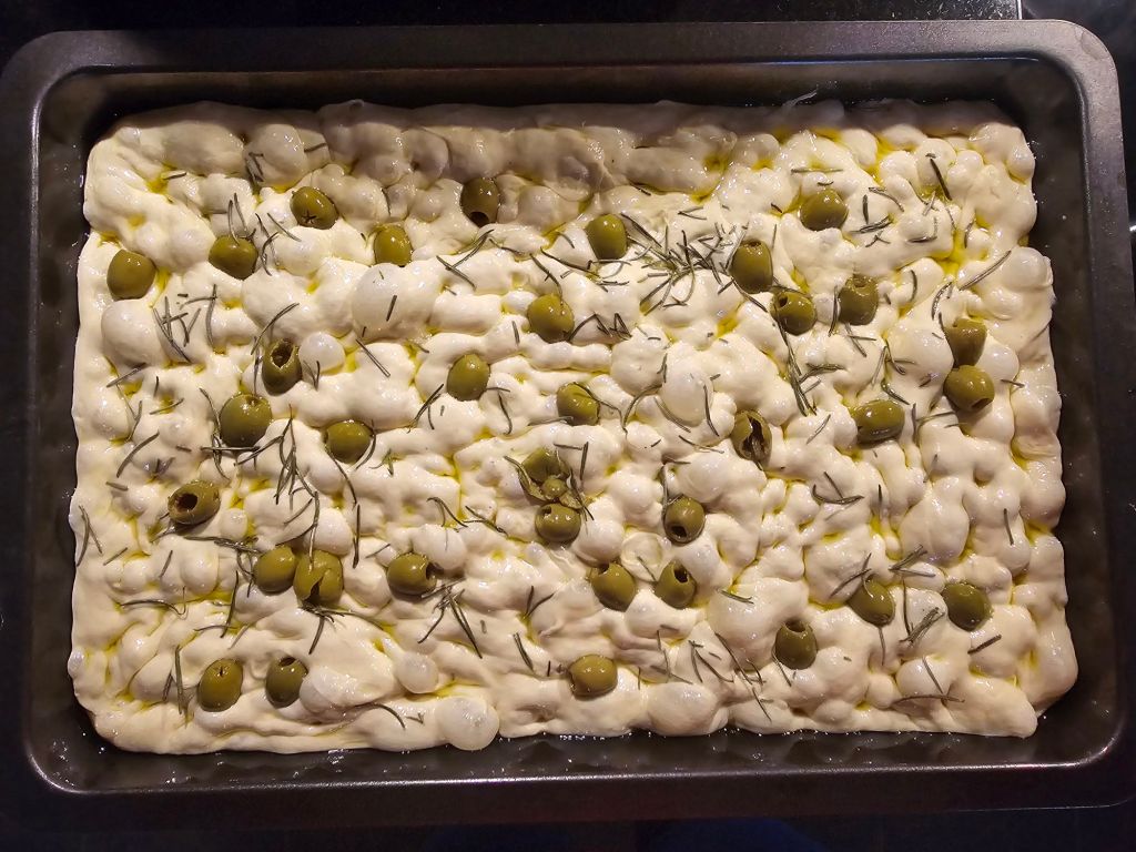 Cu mâinile evident curate și unse cu ulei de măsline începeți prin a apăsa aluatul cu degetele în așa fel încât să rămână găuri adânci pe întreaga suprafață a aluatului și apoi reintroduceți degetele in gropitele astfel formate și scuturați ușor. Veți vedea cum vor aparea bășicuțe mai mari și mai mici la suprafața aluatului. Mai rămâne doar să presărați deasupra acele de rozmarin și măslinele scurse pe care apoi să încercați cu mâna să le acoperiți cu un film de ulei de măsline pentru a nu se arde la copt. E vremea să introduceți tava în cuptorul preîncălzit la 200°C cu ventilație timp de 30-35 de minute până când focaccia e frumos rumenită. Verificați-o după 25 de minute să nu se ardă, cuptoarele coc diferit și al meu pare nițel mai leneș.