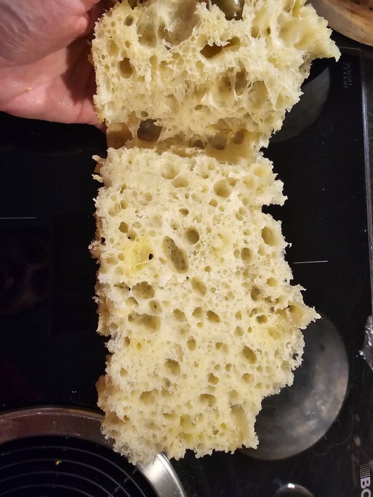 După 10 minute de răcire focaccia se poate tăia cu un cuțit zimțat pentru pâine în fâșii sau pătrate care, la rândul lor, pot fi secționate la mijloc pentru a le transforma în sandvișuri. Adevărul e că la cât de bună e focaccia simplă, ea constituie și