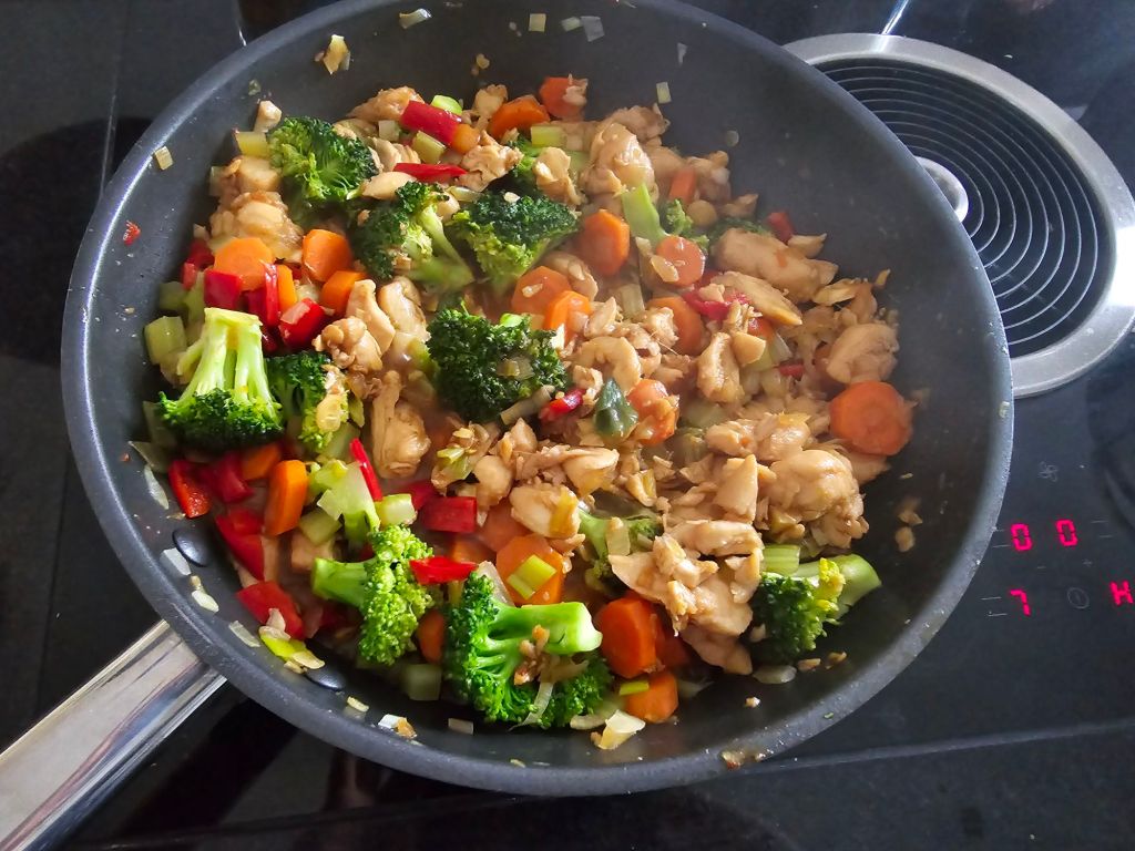 - un pui întreg tăiat în bucăţi nu foarte mici – cam cât ciocănelele; alternativ 1200g de ciocănele de pui fără piele