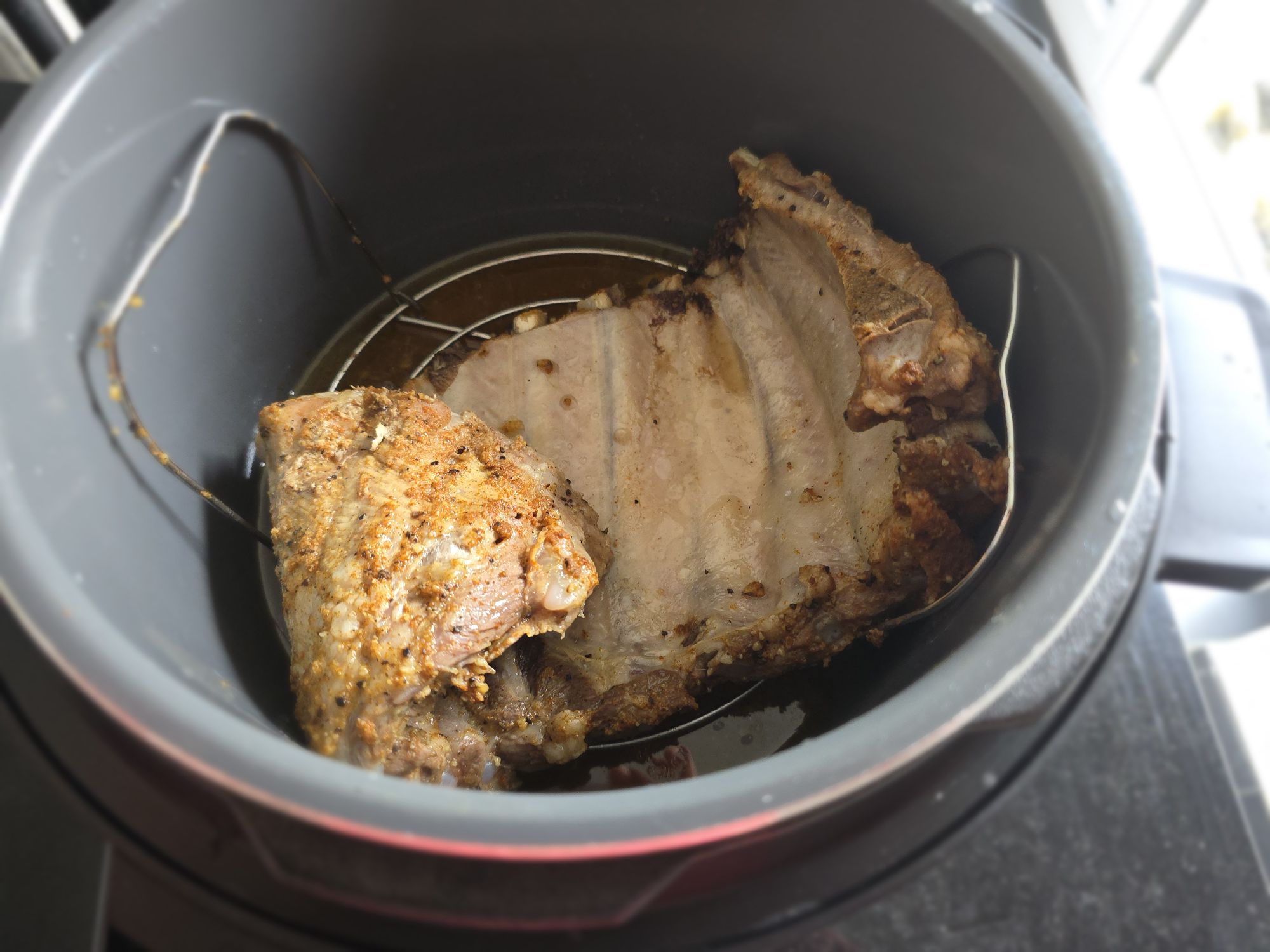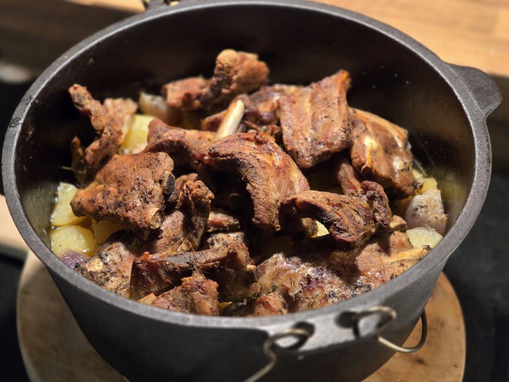 4-6 porţii, timp efectiv de gătire: 2-2,5 ore; marinare peste noapte